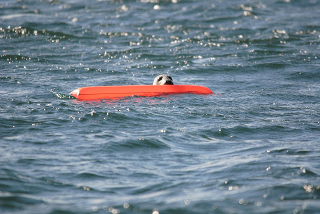 The divers send this surface marker buoy to the top of the water when they are about to come up. It also tells other boat that they are below, but the seals lover to play with them.