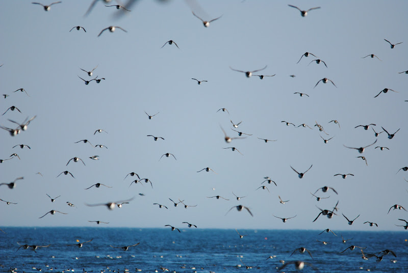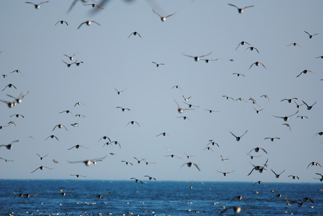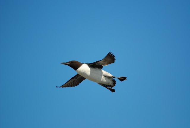 The Guillemots have been coming and going for over a month now, but this time they seem to be a lot more settled. The Puffins and Razorbills are starting to turn up, with big groups of them resting on the water. At the moment the Guillemots are steeling the show with big numbers all around the Islands. Last week the really put a show on for the customers and myself, by flying over the boat in their hundreds. Sometimes when I watch Nature programs I get so jealous of the guys seeing thousands of Penguins or Killer Whales and I realise that I do see something like this every year when the birds start to arrive to the Farne Islands.