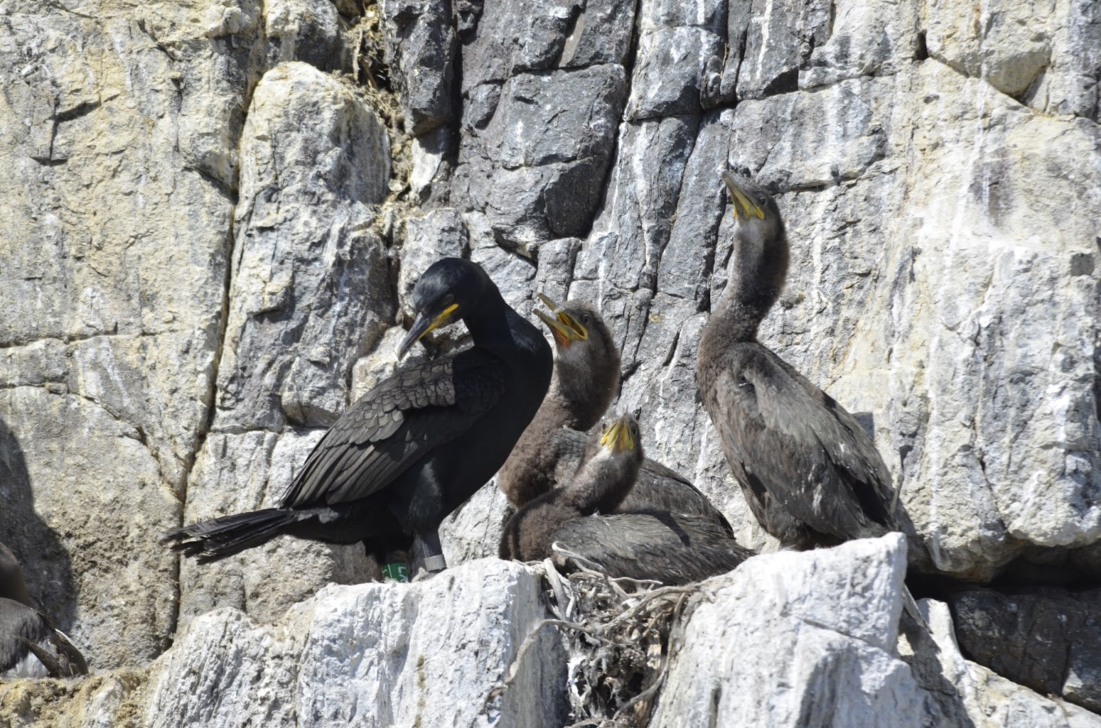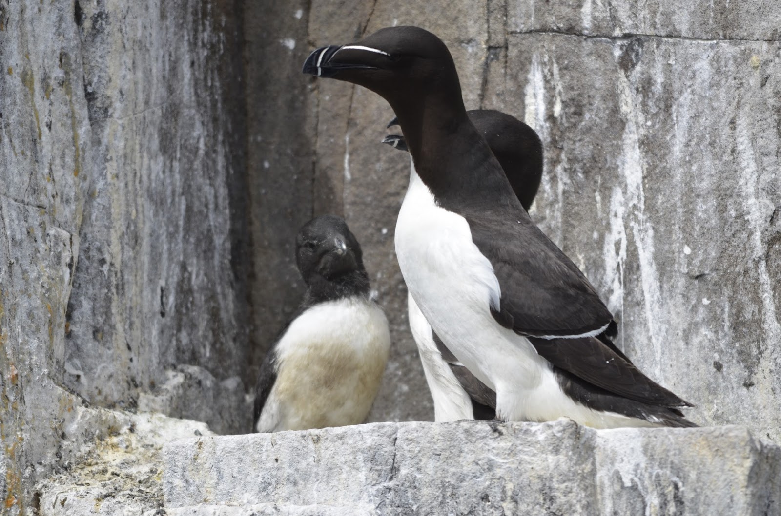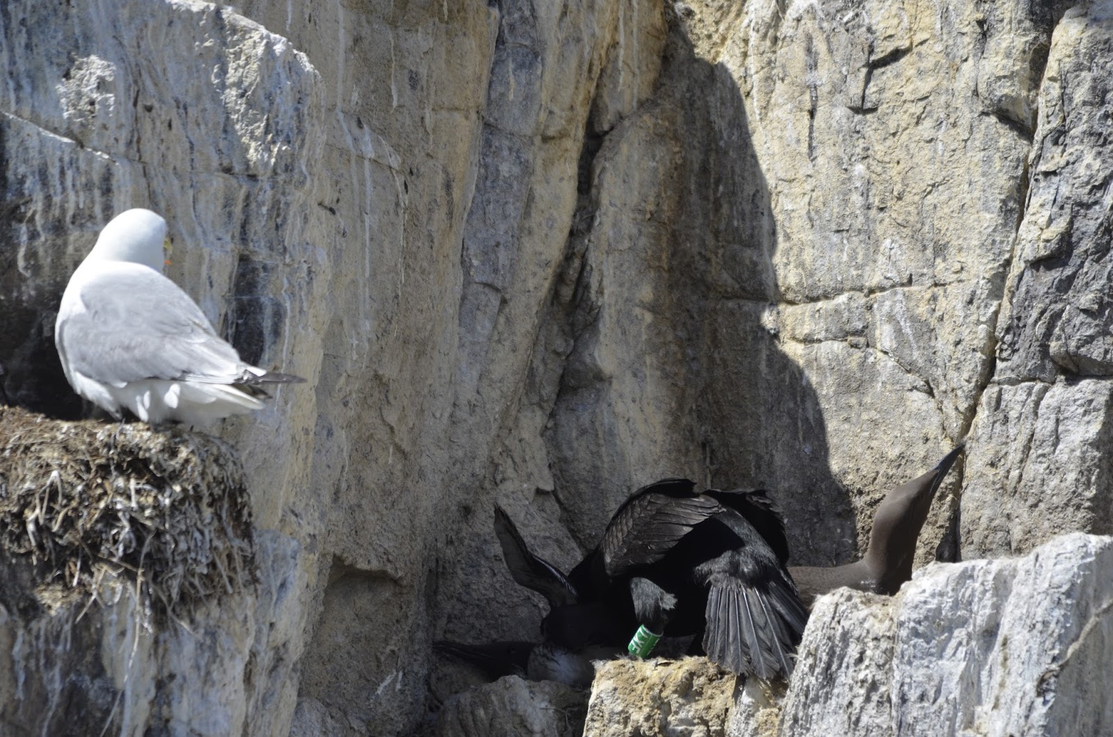 The other day Andy (my crewman) and myself witnessed a shag trying to kill a guillemot as it must have got to close to her chicks. It was in some ways fascinating to watch but then in another way it was sickening. The guillemot got away but the fear in the other guillemots eyes as she was trying to protect her chick at the same time was awful. Lucky for her the shag just went back to her chicks and never bothered her but she must have been so frightened in case she did but then further along the cliff was a young razorbill peaking out of its mother wing thinking I’m glad I’m over here and not there.