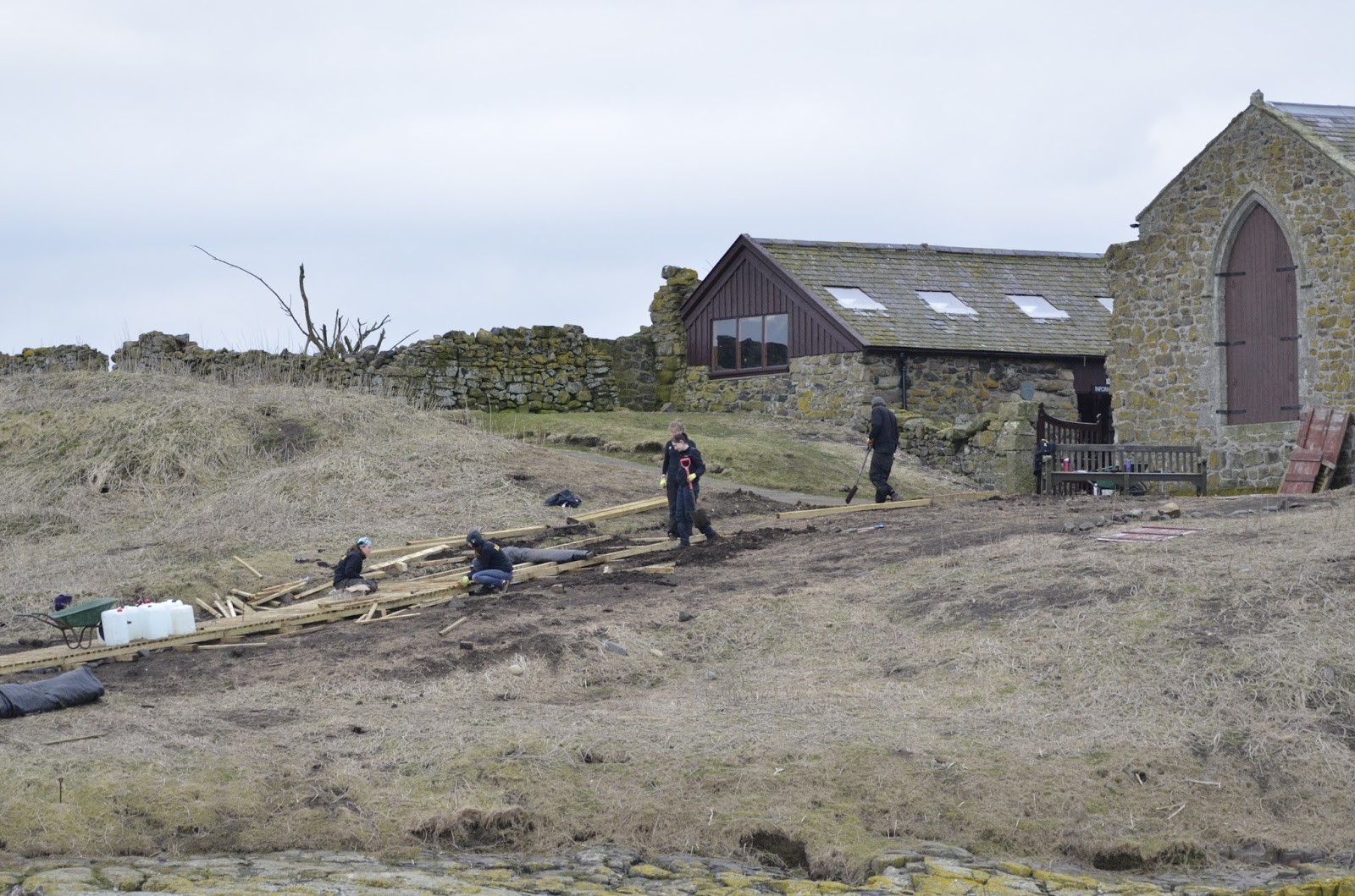The rangers mending the boardwalk towards St Cuthberts Chapel. Note no cross.